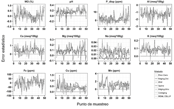 La Figura 7 muestra el error estadístico (SE) entre valores interpolados y medidos en cada punto de muestreo para todas las técnicas de interpolación.