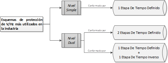 En la figura 2 se presentan tres esquemas de protección comúnmente empleados en la industria para esta función de protección V/Hz. Una desventaja de emplear un esquema de protección que solo utilice dos características de tiempo definido consiste en que pueden quedar áreas del grupo generador-transformador sin proteger. Por esta razón, se combinan las funciones de protección de tiempo definido con las de tiempo inverso, ya que proporcionan una mejor coordinación con los límites operativos del equipo.