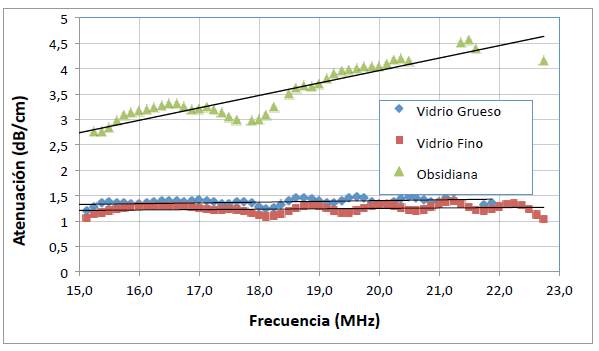 La atenuación de ondas longitudinales se presenta en la figura 4. En primera instancia se observa que dentro del intervalo de confianza del método (Cowes, 2018) la atenuación para las probetas de vidrio se solaparía, por lo que es indistinta. Por otro lado, en el rango de frecuencias de medición, se observa una mayor atenuación para la obsidiana que para los vidrios, probablemente debido a la presencia de dispersores acústicos constituidos por discontinuidades microestructurales. A su vez la dependencia de la atenuación con la frecuencia es mayor para la obsidiana que para los vidrios y esto puede estar en relación con el tamaño de los dispersores y la longitud de onda utilizada. Este parámetro puede resultar útil para determinar la procedencia de obsidianas, ya que la atenuación dominada por la microestructura puede ser independiente de la composición química, pero aun así característica de una fuente en particular. Sería pertinente contrastar estos resultados con análisis micrográficos de los mineraloides; también, sería viable incluir análisis por elementos finitos para simular la propagación en el sólido (Ramos-Cañón, Prada-Sarmiento y Vega-Posada, 2016).