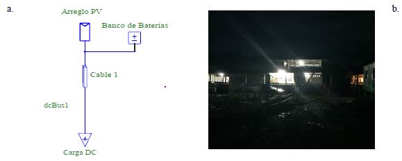 Figura 3: a. Diagrama unifilar del centro de refrigeración. b. Visión nocturna del centro educativo con servicio de energía eléctrica