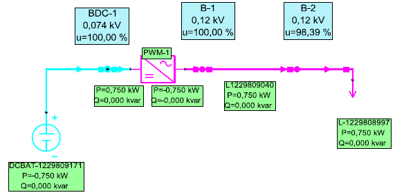 Al realizar el flujo de carga se puede observar que este cumple adecuadamente y es coherente; es decir, converge, y las tensiones en las barras es correcta, puesto que sus valores están en 0,98 y 1 en p.u. Además, no se presentan elementos ni líneas sobrecargadas, lo cual indica que su implementación en el software es exitosa y logra suplir la demanda tanto de la carga DC corno AC, a la vez que mantiene las condiciones técnicas de la microrred.
