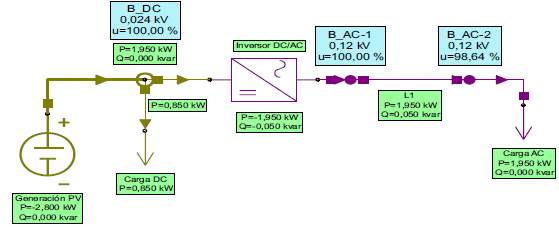 El análisis de este sistema fotovoltaico se lleva a cabo mediante el simulador Neplan. Se modela con una fuente DC, un inversor DC/AC, una carga AC (1950 W) y una carga DC (850 W). En el desarrollo de este caso se plantea un banco de baterías como la fuente de generación, por tanto, la potencia activa suministrada no es la generada por los paneles FV sino la demanda por la carga, es decir 2800 W.