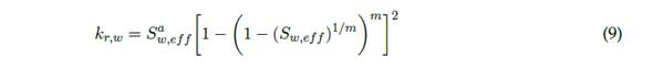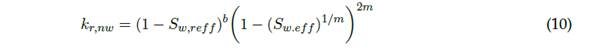 Donde: S max y S min son los valores límite máximos y mínimos de la fase líquida (S w ), respectivamente. La permeabilidad relativa de las fases de agua y aire viene dada por las ecuaciones (9) y (10), respectivamente: