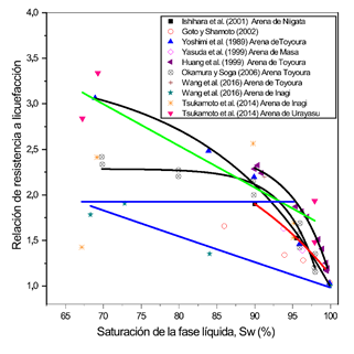 En la figura 1 se unificaron algunos tipos de suelo y se definieron las líneas de regresión para arena de Urayasu (línea verde / R2=0,87), arena de Toyoura (líneas negras / R2=0,95-0,99), arena de Niigata (línea roja / R2=1,00) y arena Inagi (líneas azules / R2=0,55 y 0,92). Los resultados obtenidos indican que se explica alguna porción de la variabilidad de los datos en respuesta a sus valores medios. Se observa que los datos con mayor dispersión respecto de su media, ordenados de mayor a menor, son los asociados a la Arenas Inagi, Urayasu, Toyoura y Niigata, respectivamente. Además, se logra percibir que la saturación de la fase líquida se asocia fuertemente en un sentido inverso con la relación de resistencia a la licuefacción.