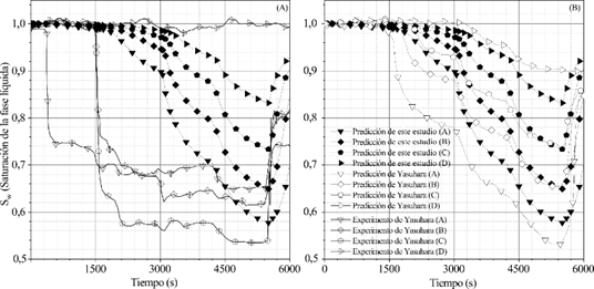 Por otro lado, para las predicciones del presente estudio se percibe que para los puntos B, C y D se alcanza un grado de saturación a los 6000 s similar al del estudio de Yasuhara, Okamura y Kochi (2008), pero para el punto D se nota que en el proceso de saturación hay un grado se saturación a los 6000 s menor que el determinado en el experimento de Yasuhara, Okamura y Kochi (2008). Sin embargo, al final de la predicción se percibe que la cantidad de aire atrapado, después de que se detiene la inyección de aire, es independiente de la presión de inyección y está estrechamente ligado al campo gravitacional. Esta figura muestra una similitud entre los resultados obtenidos por las dos metodologías. Sin embargo, se observa un retraso de tiempo del S w en A, B, C y D, de los resultados de Yasuhara, Okamura y Kochi (2008), explicado por las diferencias entre las metodologías de los modelos numéricos y las funciones de permeabilidad relativa.