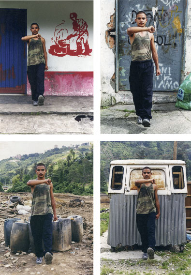 Después de varias y exitosas apariciones en eventos de arte joven, como el IV Salón Arturo y Rebeca Rabinovitch, Ávila llega a Los radioactivos (1997-2001) un proyecto que tiene el mérito especial de ser una serie fotográfica en un momento en el que este medio sufría de escasísima valoración y, por ello, vivía un retroceso. La serie en cuestión consiste en retratos frontales de jóvenes posando despreocupados en los contextos de los barrios populares o frente a imágenes de una explosión, imágenes pobremente arregladas con toda la intención de contradecir la sofisticada estética de la pintura colombiana de la década de los años 90.2 Durante toda la década, los artistas que trabajaban con la fotografía se podían contar con los dedos de la mano. Después de las avanzadas propuestas foto-conceptuales de las décadas de 1970 y 1980, realizadas por Inginio Caro, Miguel Ángel Rojas, Álvaro Barrios, Luis Fernando Valencia, Jorge Ortiz, Patricia Bonilla, Becky Mayer, Jaime Ardila y Camilo Lleras,3 la fotografía perdió su carácter crítico y volvió a ser un medio neutralmente “artístico”, es decir, una herramienta de representación de la realidad que no se cuestionaba ni la representación ni la realidad, y que se valoraba por sus componentes estéticos, la llamada “buena foto”.