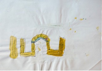 En este conjunto, que se despliega sobre un eje de más de un kilómetro y medio, Brancusi sitúa perpendicularmente al río La mesa del silencio y La puerta del beso, donde sitúa dos pilares que sostienen un dintel, simbolizando en este caso “la eterna estabilidad: su hueco, la entrada a la eternidad” (Cirlot, 1969, p. 149). En este dibujo de un niño de cinco años (Fig. 6) podemos ver representado este mismo simbolismo mediante dos columnas que sostienen un arco, como si se tratara de la entrada a un templo cuyo significado tendría que ver con la evolución y la involución, el principio masculino y el femenino o el bien y el mal; así, en “la tradición hebrea, las dos columnas se denominan de la Misericordia y del Rigor” (Cirlot, 1969, p. 149).