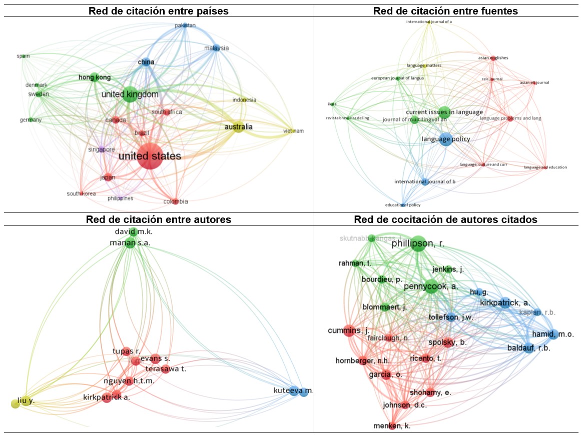 Una política lingüística es un medio por el cual se puede influir en la estructura, función, uso o adquisición de una lengua. Esta, además, se compone de un conjunto de elementos implícitos y explícitos, como las prácticas del lenguaje, las creencias e ideologías lingüísticas y los documentos o normativas oficiales. Dado que este es un tema de creciente interés para la comunidad académica y científica, este artículo busca hacer una revisión de la literatura sobre políticas lingüísticas del idioma inglés, lo cual se lleva a cabo en dos momentos. Primero, se hace una búsqueda en la base de datos Scopus para identificar tendencias y perspectivas teóricas mediante el uso de herramientas bibliométricas. Luego, se hace una selección de artículos y tesis doctorales para analizarlos e identificar su abordaje teórico y metodológico sobre política lingüística en los contextos internacional, latinoamericano y colombiano. Los hallazgos sugieren cuatro perspectivas teóricas sobre política lingüística: estructural, imperialismo lingüístico, sociocultural y multicapas. En Colombia existe una clara tendencia hacia estudios basados en las perspectivas teóricas del imperialismo lingüístico y el enfoque sociocultural, con metodologías basadas en el análisis crítico del discurso y el análisis interpretativo.