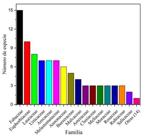 El inventario florístico en 0.5 ha (cinco transectos) reportó un total de 30 familias botánicas, 65 especies y 322 individuos con DAP ≥ 10 cm; lo que da como resultado un ecosistema con una alta riqueza de familias, pero con baja abundancia de especies. Las familias que presentaron mayor número de especies fueron: Fabaceae, Euphorbiaceae y Lauraceae con 15, 10 y 8 taxones, respectivamente, que representaron un 50.77 % del total de especies inventariadas en la zona de estudio. Siguen, en orden de representación, tres familias (Urticaceae, Arecaceae y Melastomataceae) con siete especies; luego, tres familias (Annonaceae, Burseraceae, Malvaceae) con una composición de cuatro y seis especies; posteriormente, siete familias (Asterecaeae, Clusiaseae, Meliaceae, Moraceae, Rosaseae, Rubiaceae y Salicaceae) con dos y tres especies; y, por último, 14 familias con una sola especie (figura 2).