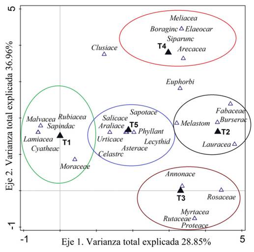 Las familias que más contribuyeron a la biomasa en el sitio fueron seis (Malvaceae, Rubiaceae, Sapindaceae, Lamiaceae, Cyatheaceae y Moraceae); en se agruparon cuatro familias (Fabaceae, Burseraceae, Melastomataceae y Lauraceae) con menor cantidad de familias contribuyentes al total de biomasa acumulada; T3 resultó con cinco familias (Annonaceae, Rosaceae, Myrtaceae, Rutaceae y Protaceae); T4 estuvo representado por cinco familias (Meliaceae, Boraginaceae, Elaeocarpaceae, Siparunaceae y Arecaceae); y T5 con ocho familias participantes (Sapotaceae, Saliaceae, Araliaceae, Urticaceae, Phyllantaceae, Lecythidaceae, Asteraceae y Celastraceae), resultando con mayor número de familias. Se evidenció que las familias Clusiaceae y Euphorbiaceae mostraron un patrón diferente a las demás; las cuales no estuvieron asociadas a ninguno de los transectos, lo que indica una menor correlación con el resto de la composición familiar. Esta característica se debió a la baja representatividad como reservas de carbono.