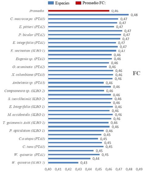 En el corregimiento de Pacurita, las 23 especies con mayor peso ecológico presentes en las tres PPM presentaron una Fc promedio de 0.46, con un rango de 0.44-0.47. Esto, a fuerza de algunas especies que presentaron los valores más altos, como la E. integrifolia y C. webervaueri, mientras que B. nívea presentó el valor más bajo (Figura 2).