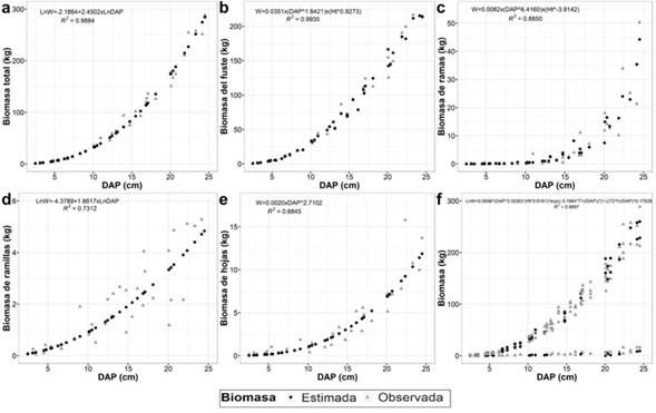 Los modelos que presentaron significancia (tests de “F” y “t”) y mejores indicadores estadísticos se muestran en la Tabla 2. El modelado de los frutos no presentó ajustes significativos. Las funciones de los modelos seleccionados para estimar la biomasa total (M4), fuste (M11), ramas (M11), hojas (M9) y biomasa total o del fuste u hojas más frutos (M14) presentaron mejor conformación con respecto a los datos observados en campo (Figuras 4a, 4b, 4c, 4e y 4f) en comparación con el de ramillas (M4) (Figura 4d). La variabilidad de la biomasa total fue explicada en un 98.84 % por DAP, así como en 88.45 y 73.12 % en hojas y ramillas respectivamente. En el caso del fuste y las ramas, fue necesario incorporar la Ht para explicar la variabilidad de 99.35 y 88.50 % respectivamente. El grado de explicación de los modelos disminuyó conforme los componentes contenían menor biomasa, lo cual concuerda con lo obtenido en la correlación (Figura 3). No obstante, el uso de variables ficticias en los modelos M12 y M14 permitió una mejor estimación de estos componentes (R 2=0.9902 y 0.9897).