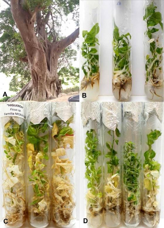 Figure 3: A. Ficus americana tree calculated to be more than 50 years old. B. In vitro seedlings of F. obtusifolia after six months of culture. C. Germplasm conservation of F. obtusifolia after 24 months of culture. D. Germplasm conservation of F. americana after 12 months of culture