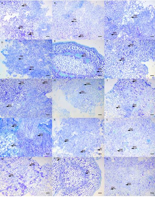 The callus observed in all treatments were friable and yellowish and had increasing mass increments (g). The following morphological structures were observed in BI accession, which are also identified in Figure 2: round agglomerated cells (rac) - rounded cells, dispersed or associated with agglomerated cells; agglomerated elongated cells (aec) - elongated cells, dispersed or associated with cellular agglomerations; small agglomerated cells (sac) - formed by small and isodiametric cells; small scattered (sc) cells - comprised of small, dispersed cells; and vascular bundle (vb) - an anatomical structure of the stem. Cells in dedifferentiation were observed in all the studied accessions.