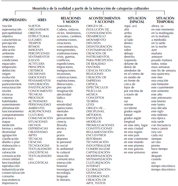 Desde un método heurístico (Vanegas y López, 2015a) se puede llegar a explicar ¿qué son las categorías culturales?, ¿cuál es su sustento teórico-filosófico?, ¿cómo se presentan y qué procesos favorecen?, ¿cómo se clasifican?, ¿para qué sirven?, ¿cuál es su papel en la lectura y la escritura? Estrategia a través de preguntas que permiten profundizar en un objeto de estudio. Sin embargo, dicho cuestionamiento requiere de puntos de partida, como las categorías si se quiere instrumentalizar verdaderamente el proceso lector y escritor.