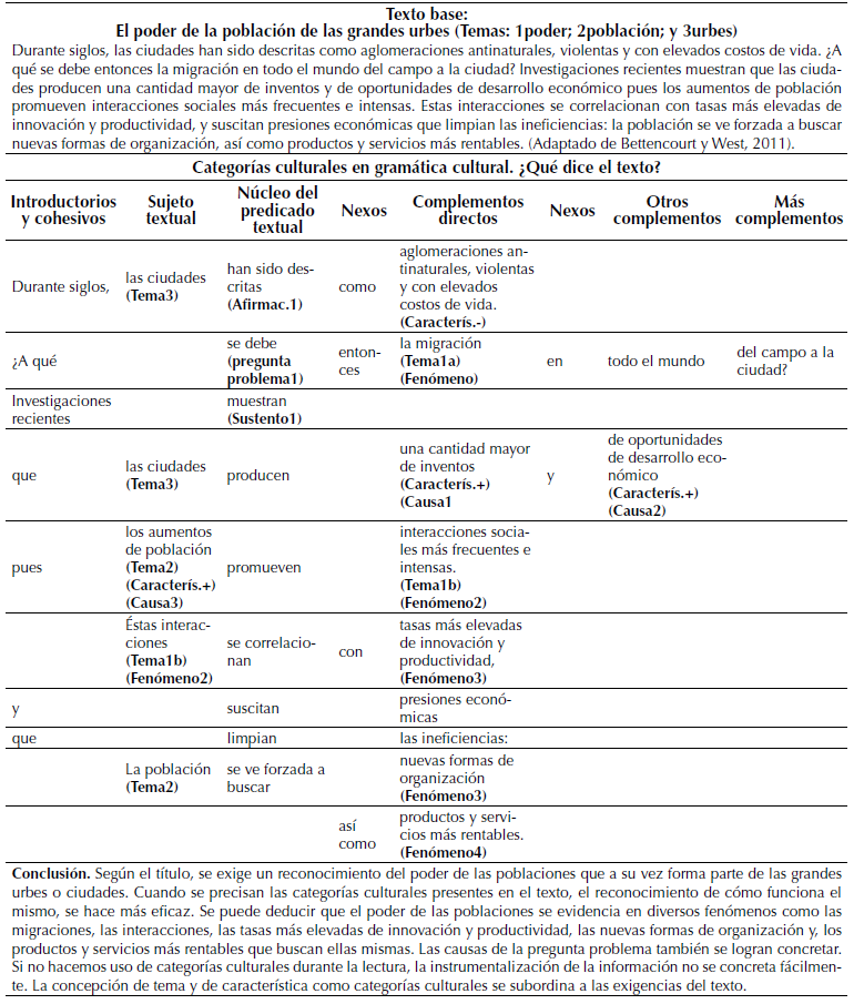 Puede decirse que se echa una red específica de gramáticas textuales que responden en el caso de las categorías culturales a una gramática cultural general: ¿Qué dice? ¿Esto a qué corresponde? ¿A qué se está refiriendo?, elementos que buscan dar claridad sobre un concepto o definir o teorizar, y son categorías de carácter transdisciplinar, inferencial y coadyuvante de otras categorías y gramáticas. Se toma un texto base, a modo de ejemplo, para mostrar en este la coexistencia de diversas gramáticas.