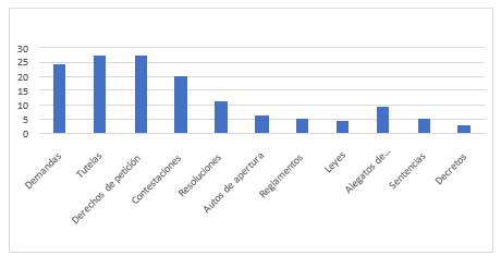En esta perspectiva, en la emergencia de los géneros más usados tanto en la formación como en la práctica profesional, se observa que la fuerte presencia de géneros como demandas tutelas, derechos de petición, contestaciones, leyes y sentencias permite señalar cierto privilegio hacia el conocimiento de la ley y la jurisprudencia, sobre posibles ejercicios de pensamiento y lectura crítica.