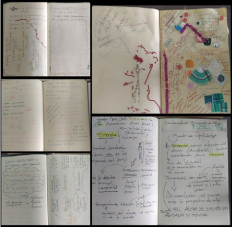 La CostURA y la esCritURA, de manera indefectible, bosquejaron desde el principio un modo de investigar diferente, pues el método se fue consolidando en el proceso; en el antes, durante y después de la creación del taller. Por ejemplo, los cuadernos de notas de la investigadora (figura 5) se convirtieron en punto de partida para confeccionar el método, en tanto que advirtió de modo no consciente, en principio, los tránsitos por la cartografía, la corpografía y costurografía. Los dibujos, la escritura discontinua, coser en los cuadernos, cortar, pegar, trazos disimiles (Brizuela, 2016) para ir en busca de la afección; pistas pespunteadas como fuga, gesto, costura, aguja, tela, hilo, urdimbre acciones que le hablaron al oído a la investigación y a este articulo: ir tras las afecciones es hacerse cargo de las zonas de la vida como lo nombró María Zambrano, es ir tras un saber sí –del que hablara Fernando Bárcena– y que se hizo borroso en el encuentro educativo, es ser amigo de sí mismo tal y como lo escribió Michel Foucault en su obra Hermenéutica del sujeto, es responder al júbilo que halló el cuerpo laberinto cuando su piel tela se pudo rasgar para ir al encuentro de una afección que al ser hallada comenzó a respirar y a vivir de otra manera (Zambrano, 2019). Así, la escucha atenta nos llevó a descoSER y recoSER la figura del cartógrafo por cuanto tiene su propio trayecto y realiza análisis acorde a la asistencia al taller (Martínez, 2019). Para el caso de este estudio, el trayecto de la investigadora se fue delineando por los tránsitos señalados por los maestros: unas veces lineales, otros curvos, otros sin salida, otros forzosos, otros intensos,