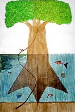 “El mito de ese árbol es profundo y céntrico porque ese no es de este momento, sino de cuando no hubo nada, cuando el tiempo y el espacio eran puros, vacíos.”... Cuenta que el río nació del vacío que dejó un árbol al caer, uno muy similar al Árbol de la Vida. El Árbol del agua, es como se conoce ese otro coloso. Su caída dejó un hueco tan profundo y largo que lentamente fue llenado por el agua. Pero el árbol no cayó solo, fue derribado por dos personas, el Zorro y el Zogui Zogui... El tronco, en su parte baja, justo donde toca la tierra, formó, ya caído, el delta del río, la conexión con el mar; allí mismo quedaron las raíces del gigante. Al otro extremo sus ramas y nervaduras, al golpear fuerte el suelo, crearon los afluentes que dieron forma al territorio que llamamos Amazonia 18.
