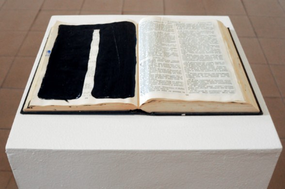 Y, como parte de un proceso de observación, me encuentro con la posibilidad de intervenir La Biblia; en Guatemala hablamos 22 idiomas, 23 con el castellano. La Biblia se encuentra bilingüe, en tzutujil, Kakchiquel, entre otros idiomas maya y en castellano. Con esta obra de las biblias, lo que hago es pintar, borrar, el castellano y dejar el camino más importante, dejar el idioma maya. De manera que, si yo quiero leer La Biblia aquí y ahora, prefiero leerla en mi idioma maya, gesto que se configura como una manera de sanar y de retornar.