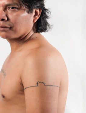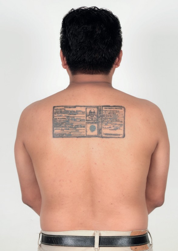 Esta cédula, tatuada en mi espalda es la cédula de Doroteo Guamuche. Él es un indígena, sangre indígena, nombre indígena, apellido indígena, ganó la maratón del 52 (1952, Boston). Pero un “gringo” no pudo pronunciar su nombre, Doroteo Guamuche, y lo simplificó (modificó) en Mateo Flores. Ahora bien, entre 1944 y 1954 que es la época de la revolución en Guatemala, en la misma época construyeron un estadio que se llamaba Estadio Olímpico de la Revolución. Pero cuando cayó la revolución y todo se vino abajo cambiaron el nombre del estadio por el mismo que había simplificado el “gringo” y se le puso el nombre de Mateo Flores. En Guatemala el 70% somos indígenas, y es un país donde perdura el patriarcado, el racismo, la exclusión y el epistemicidio. Entonces Doroteo Guamuche quedó en el silencio para toda la vida, porque no fue nombrando desde sus raíces indígenas, fue cambiado por la palabra de occidente. Es cierto que muchos cambian los nombres y apellidos ahora, cambian nombres y apellidos por ser indígenas, por tener sangre indígena y por tener acento indígena prefieren cambiar los nombres y los apellidos. Sin embargo, en este caso, no fue así, es una herida colonial y es importante sanar esa herida, desde las prácticas y el pensamiento indígena. Por esta razón, conseguí una copia de la cédula de Doroteo Guamuche, algo que me costó tanto, porque pedir una cédula en Guatemala, un país de mucha violencia, extorsión, y muertes, es difícil. Además, hablé con la familia de mi intención de tatuarme la cédula de Doroteo Guamuche, tatué la cédula en mi espalda con el propósito principal de proponer a las autoridades de turno cambiar el nombre del estadio, porque es justo y necesario que se pueda sanar esa herida colonial. Así, estuvimos en un proceso con unos diputados indígenas que estaban interesados en hacer una ley en el Congreso para cambiar el nombre del estadio. El campeón Mateo Flores, no es nuestro, no existe, no existió; es necesario cambiar el error en la historia; nuestra historia está herida porque nos tuvieron en comillas, en paréntesis. Con este gesto yo estoy quitando esas comillas, esos paréntesis y nombrando desde la realidad.