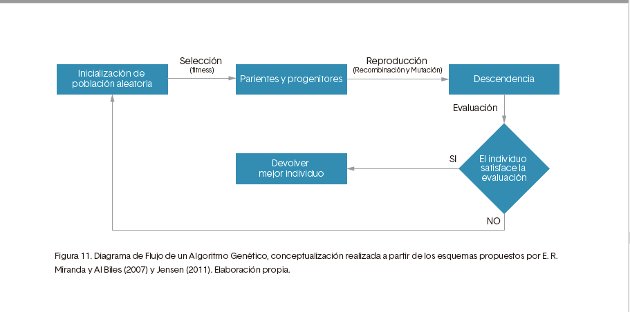 Figura 11. Diagrama de Flujo de un Algoritmo Genético, conceptualización realizada a partir de los esquemas propuestos por E. R. Miranda y Al Biles (2007) y Jensen (2011). Elaboración propia.