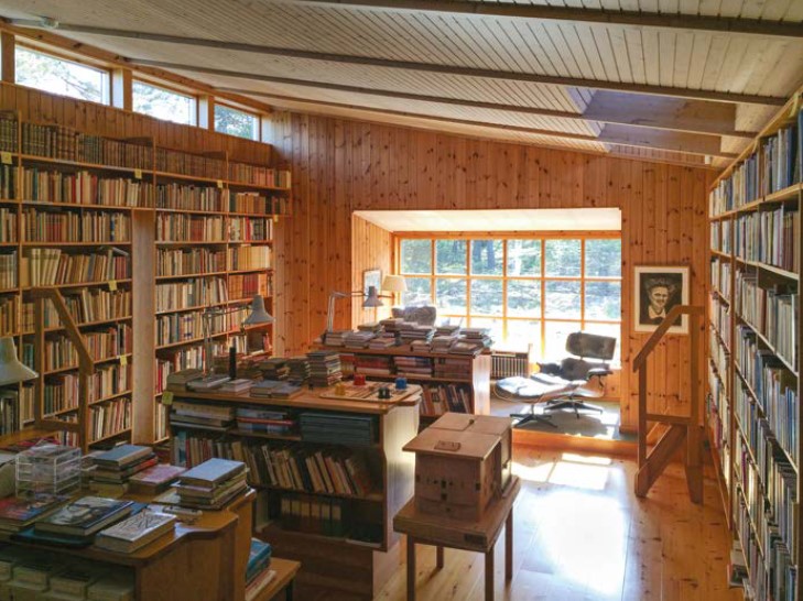 Los espacios, construidos con pinzas por su habitante principal, se extienden a lo largo: un cuarto para la meditación, otro con las paredes tomadas por casetes de VHS y un televisor para las noches de insomnio, el lecho nupcial donde moriría su última esposa, Ingrid y después, el mismo Bergman, tras varios años de reclusión final en la helada isla de sus profundos encantos. A un extremo, la biblioteca, cerrada al público por culpa de los ladrones de ocasión, donde hay de todo, de Strindberg a García Márquez, de traducciones de sus propios libros a copias autografiadas de sus amigos (Ingrid Bergman, Woody Allen, Liv Ullmann…).