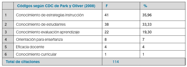 En la tabla 3, se observa en primer lugar, que el puntaje más alto corresponde al componente estrategias de instrucción para enseñanza, con un valor de 41 citas que representa el 35,96 % de la totalidad del modelo CDC. En segundo lugar, está el conocimiento de estudiantes, con 38 citas que representa el 33,33 % del CDC. En tercer lugar, aparece la evaluación del aprendizaje de estudiantes con 22 citas, equivalentes al 19,3 % del CDC. Finalmente, el 11,4 % restante de la codificación se distribuye entre los otros tres componentes que integran el modelo hexagonal CDC de Park y Oliver (2008). Y se señala que, el último lugar en la tabla de resultados lo tiene el currículo para educación musical, con solo una cita que equivale al 1 % del total del CDC.