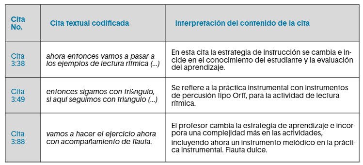 Tabla 4. Codificación de citas en la categoría ‘estrategias de enseñanza’ en el análisis de la transcripción del video de la práctica del profesor de música.