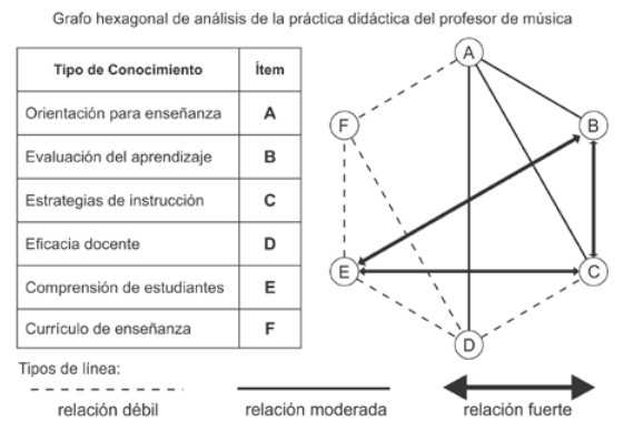 Luego, en la orientación para la enseñanza (ítemse presenta un grado moderado de relación con las componentes más fuertes y este vínculo se indica mediante una línea continua más delgada. Finalmente, las relaciones débiles, mínimas o nulas entre los componentes se representan en la gráficahexagonal con líneas segmentadas o se dejan sin líneas de conexión entre los componentes.