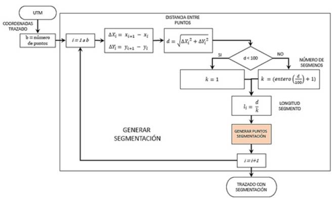 Si la distancia es menor a 100 metros no se hace segmentación y se continúa con el siguiente par de puntos como se muestra en el diagrama de bloques de la figura 4. En total, para el caso de estudio, se obtienen 474 segmentos, lo que representa que se generan 475 pares de puntos (474 + 1) en coordenadas cartesianas que sustituyen a los 13 puntos iniciales, conservando la misma trayectoria.