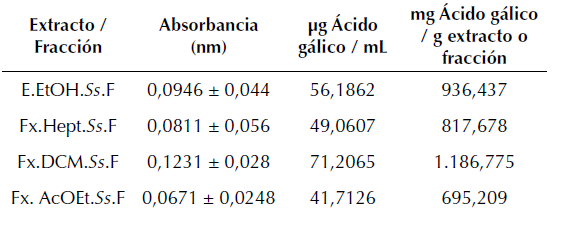 Con la curva de calibración realizada con los patrones de ácido gálico (Tabla 3) se encontró la función lineal que representaba la relación (Absorbancia = 0,0019* (concentración de ácido gálico en mg L-1) - 0,0143), se realizó la lectura espectrofotométrica del extracto y las fracciones, se hizo la correlación entre la curva y los valores obtenidos, los cuales se muestran en la tabla 4.