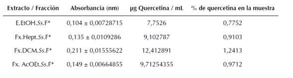 Con la curva de calibración realizada con los patrones de quercetina (Tabla 5), se realizó la relación lineal que arrojó la función lineal absorbancia = 0,02296* (concentración de quercetina) - 0,0739. Bajo las mismas condiciones se midieron las absorbancias de las soluciones del extracto y las fracciones, y tras realizar la correlación entre la curva y los valores obtenidos se tienen los resultados consignados en la tabla 6:
