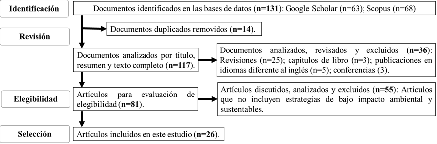 El presente enfoque sustentable y eco-amigable para la obtención de 2-pirazolinas, en esta revisión, bajo la perspectiva PRISMA (Page et al., 2021), cubre los desarrollos en el campo de los compuestos heterocíclicos bioactivos a partir de protocolos en los que se combinan estrategias sintéticas de bajo impacto ambiental con la síntesis clásica de esta clase de compuestos. Los criterios de selección que establecen los límites de la presente revisión se aplicaron a artículos reportados e identificados durante la búsqueda en las bases de datos Google Scholar y Scopus. Los criterios de inclusión fueron: 1) trabajos que incluyen análisis y resultados de variación de parámetros de reacción, 2) artículos que incluyen enfoque eco-amigable con resultados o información completa, 3) artículos publicados desde 2019 hasta 2021. Los criterios de exclusión fueron: 1) revisiones, 2) artículos publicados en un idioma distinto del inglés, 3) actas, actas de congresos, disertaciones, patentes.