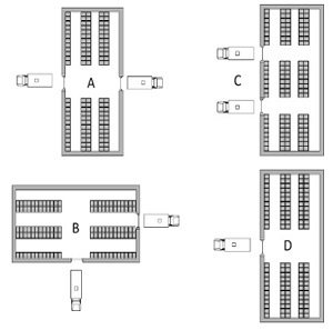 En la Figura 1 se identifica que en las configuraciones I-Shaped, U-Shaped (a) y L-Shaped , las operaciones de recepción y envío se realizan en muelles independientes; en este caso, el proceso de dimensionamiento de las zonas de recepción y envío se realiza de manera individual calculando el número de muelles para cada operación respectiva [4]. Por lo contrario, en la configuración U-Shaped (b) el cálculo de muelles se realiza de manera integrada, es decir, se generaliza a un solo movimiento promedio de material que se recibe y envía.
