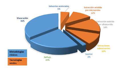 Las extracciones de las saponinas se pueden clasificar en dos categorías: las metodologías clásicas y las tecnologías verdes[11]. Las metodologías clásicas normalmente son extracción Soxhlet, extracción sólido líquido empleando grandes cantidades de solventes, mientras que las metodologías verdes emplean ultrasonido, líquidos ultrapresurizados, entre otros[12]. Otra alternativa para una extracción previa a una purificación es la mezcla de metodologías convencionales y tecnologías verdes; por ejemplo, realizar extracciones con solventes, evaporar empleando rota evaporación, redisolución en agua y liofilización, evitando que las características fisicoquímicas del extracto se vean afectadas[13]. En la Figura 1, se puede observar que el tipo de extracción utilizada por los investigadores se centra en métodos convencionales (con un 75%), aunque estos consuman grandes cantidades de solventes[11].