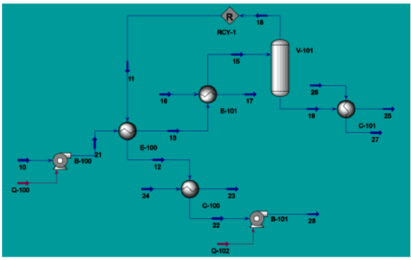 Se simula como un evaporador de un solo efecto (solo un efecto debido a la concentración tan baja de las saponinas que no permite tener rampas de evaporación). La salida del sedimentador (flujo 10) se alimenta de un intercambiador E-100, donde la corriente se precalienta antes de ser enviado a otro intercambiador E-101 que emplea vapor de baja presión para entregar el calor necesario con el fin de obtener una corriente líquido-vapor que se separa en la unidad V-101. La corriente vapor del flash (flujo 18) se recircula al intercambiador E-100 como precalentamiento de la corriente a tratar para luego enfriarse en la unidad C -100 y así retornar como agua destilada al mezclado de materias primas. En la unidad C-101, se enfría el producto terminado (flujo 27) que está a la concentración deseada (0,002149086 en fracción mol o 0,039257825 en fracción masa). Las unidades C-100 y C-101 emplean agua de enfriamiento estándar (Figura 4).