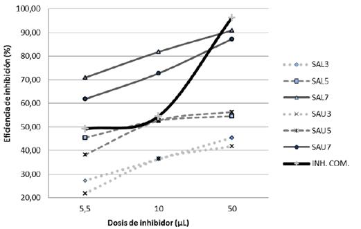 Se exhibe que, al contrastar las medias de cada agente respecto a los otros, los inhibidores a base de salvia y saúco en sus máximas concentraciones presentan diferencias significativas con respecto a sus respectivas bases a menores proporciones, por lo que son estadísticamente similares solo entre ellos mismos (SAL7 y SAU7) y respecto al aditivo comercial.