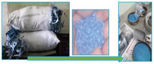 En primer lugar, se llevó a cabo la trituración de los residuos provenientes del sistema de descarte, para lo cual se utilizó un molino triturador de plásticos industrial. Posteriormente, el material fue tamizado en un equipo electromecánico; el proceso se realizó en varias sesiones de 15 minutos y se utilizaron 100 g de material en cada sesión de tamizado. En la Fig. 1 se evidencia la presentación inicial de los residuos hasta el proceso de tamizado. Las mallas utilizadas y la granulometría se mencionan en la Tabla II. Con estas se realizaron cuatro diferentes mezclas (A, B, C y D). La mezcla de la celulosa y el sistema de vulcanización fue llevada a cabo en un molino industrial de cilindros abierto.