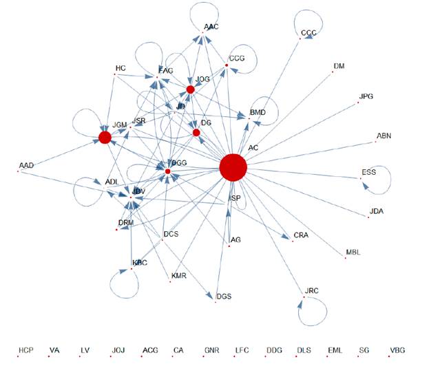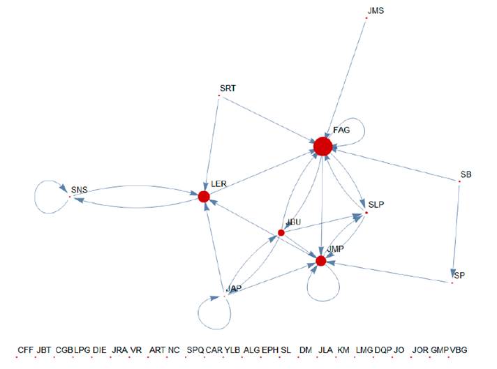 The resulting information is a valuable support for the implementation of strategies in the content of a course assisted with virtual platforms, since the social structures that result from the different forms of relationship are identified, which allows mapping or analyzing the relationships between people, cooperation between actors, groups, or communities, among others.