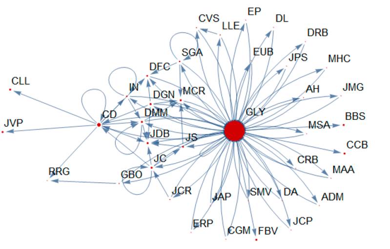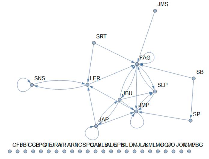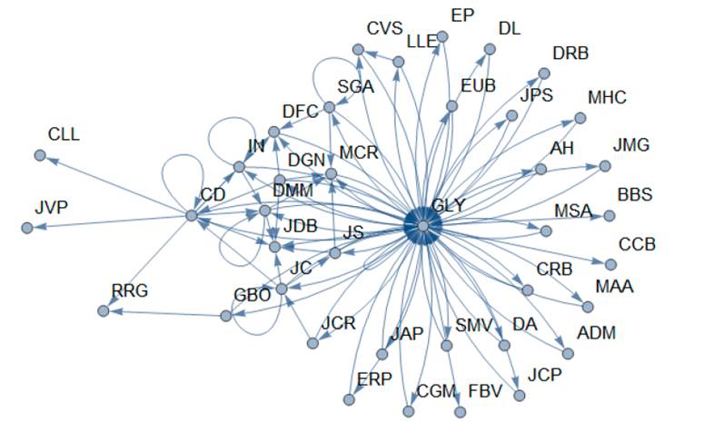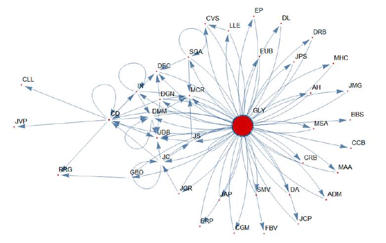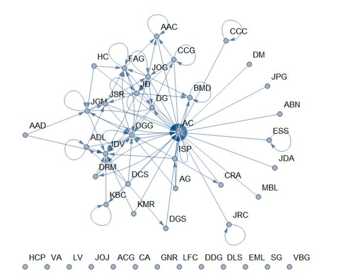 Con el grado de centralidad se pueden identificar aquellos actores con mayor cantidad de interacciones en el grupo y que tienen influencia en el mismo. Para realizar el análisis se utilizaron diferentes funciones, entre ellas Part —una función que proporciona una parte indexada de una expresión—, VertexList —devuelve la lista de vértices o nodos—, Ordering —ordena la posición en la que todos los elementos de la lista aparecen—, Greater —señala desigualdad fuerte o estricta, utilizando aproximaciones numéricas para establecer un orden numérico.