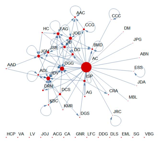 A continuación se muestra gráficamente la centralidad de grado de cada curso: para el curso 1 figura 8, para el curso 2 figura 9 y para el curso 3 figura 10, donde los puntos rojos con mayor tamaño corresponden a los vértices que poseen mayor cantidad de conexiones, cabe mencionar que los nodos que no tienen relación o no han tenido intervención dentro de la plataforma fueron eliminados para evitar ruido en los datos analizados.