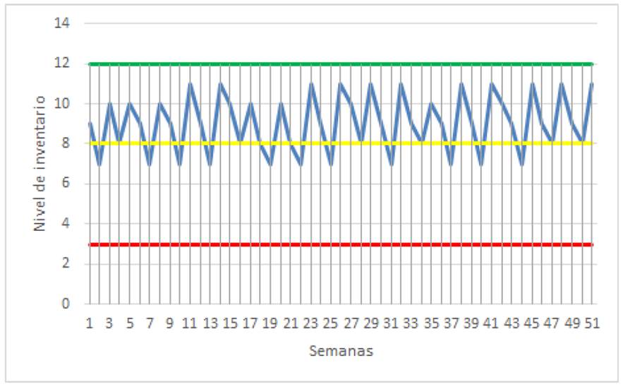 Para realizar la clasificación ABC en la compañía objeto de estudio se utilizaron valores de venta de los 2.728 artículos que ha manejado la ferretería en el último año de operación, luego de la aplicación de la regla de Pareto, se logró identificar un listado de 81 artículos críticos (considerados tipo A) que representan el 80 % de los ingresos de la compañía. Para cada uno de estos productos se realizó un levantamiento de la información necesaria para el cálculo de los niveles de buffer para el uso de la metodología Demand Driven MRP. La Tabla II muestra el cálculo de las zonas de buffer obtenidas para algunas referencias críticas de la organización teniendo en cuenta información como Lead Time, promedio de consumo semanal, cantidad mínima de pedido, entre otros. La red de Petri presentada en la Figura 3 fue simulada por un lapso de 52 semanas utilizando Visual Basic de Excel, para verificar el comportamiento de la estrategia propuesta comparado conlos datos históricos del año 2020. Se debe tener en cuenta que el periodo de revisión que se considera dentro de la simulación es de dos semanas, partiendo del hecho de que los proveedores de la ferretería tienen un tiempo de entrega estimado de una semana. Asimismo, se simula una demanda aleatoria para cada producto que se comporta siguiendo una distribución estadística que se obtuvo a partir de un análisis detallado del histórico de ventas del año 2020. En la Figura 4 se puede observar cómo el nivel de inventario de un producto referente para la organización (representado por la línea azul), en las 52 semanas de simulación, oscila entre la zona amarilla y verde del amortiguador diseñado, por lo que se demuestra que la red de Petri programada representa fielmente a la metodología Demand Driven MRP. Asimismo, se logra demostrar que la metodología DDMRP evita la generación de sobrestock de inventario (en ninguna de las semanas simuladas el nivel de inventario promedio supera la zona verde del buffer establecido), al tiempo que reduce la posibilidad de agotados (el inventario no llega a estar en la zona roja en ninguna de las 52 semanas de simulación).