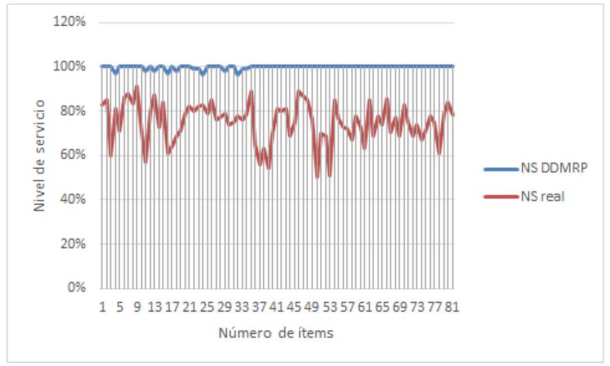 Figura 5: Comparación entre el nivel de servicio real para el año 2020 y el nivel de servicio obtenido por la metodología DDMRP