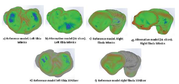 The alternative model (16 slices) for the fibula shows that the mesh size is extremely large, and it does not properly describe the curvature in the proximal zone of the fibula. On the contrary, the curvature along the shaft of the fibula is very similar since the geometry is less complex than the fibular head. Figs. 5e and 5f show the reference model reconstructed using 3DSlicer. The first interesting result is related to the size of the elements. The mesh created using the same procedure in Mimics provides a reference model with more details in the proximal zone of both bones. The curvature is similar for the model reconstructed using Mimics for the proximal zone. However, the surfaces are smoother when reconstructed using Mimics.