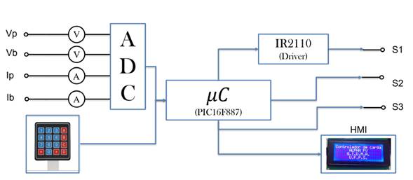 En la Fig. 2 se muestra la arquitectura del controlador de carga que tiene como componente central el microcontrolador PIC16F887. Esta captura los valores de voltaje y corriente del panel solar y la batería a través del convertidor analógico a digital (ADC) que se conecta con los sensores de corriente y voltaje. Se utiliza el circuito integrado IR2110 para lograr la operación del convertidor DC/DC tipo Buck, debido a la baja diferencia de tensión entre el panel solar y la batería. El controlador de carga cuenta con un teclado matricial de 4x4 y una interfaz humano-máquina (HMI, por sus siglas en inglés) compuesta por una pantalla LCD de 4x20. Las salidas S2 y S3 se conectan a dos interruptores, uno para verificar el estado de carga inicial de la batería y otro encargado de conectar o desconectar la carga dependiendo de la energía almacenada en la batería