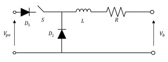En la Fig. 4 se muestra el convertidor DC/DC propuesto, el cual consta de un diodo D1 que evita el flujo de corriente desde la batería hacia el panel solar en horas de baja radiación, un interruptor conmutado S, un diodo D2 como interruptor fijo, un filtro de corriente L y una resistencia R encargada de limitar la corriente de salida del convertidor. Nótese que no se utiliza un capacitor a la salida del convertidor DC/DC debido a que la carga es una batería y esta mantendrá una tensión de salida en DC aproximadamente fija que aumentará a medida que la batería cargue, por lo cual este se hace innecesario.
