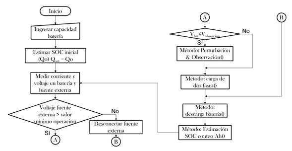 El funcionamiento del controlador de carga se describe en la Fig. 5 y consiste en varias funciones que permiten la carga o descarga de la batería, así como la estimación del estado de carga, las cuales se explicarán a detalle en las siguientes secciones. De manera general, el controlador de carga sigue estos pasos: se debe ingresar la capacidad de la batería de ácido de plomo. Con esto, se estima el estado de carga (State of Charge, SOC) inicial. Luego, se procede a medir los valores de voltaje y corriente en la batería y el panel solar a través de los sensores para determinar si el panel está en capacidad de entregar energía a la batería. Después de esto, se valida si la batería debe ser cargada al comparar el voltaje de la batería con el de absorción (este voltaje corresponde a un SOC aproximado de 80 % y, para baterías de ácido plomo, es de aproximadamente 14,25 V). Se procede a aplicar el método de carga de dos fases o el método de descarga según la respuesta obtenida y, para finalizar, se estima el estado de carga actual con base en el método de conteo de amperios- hora y se reinician las mediciones de voltaje y corriente en batería y panel para monitorizar el estado de carga de la batería y el funcionamiento del sistema.