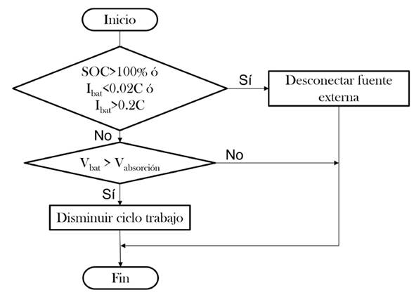 En caso de que se presenten las condiciones permitidas para cargar la batería, el algoritmo evalúa si se alcanzó el voltaje de absorción, pues, de ser el caso, el ciclo de trabajo del convertidor debe disminuirse para mantener este voltaje en la batería y reducir la corriente que ingresa a esta.