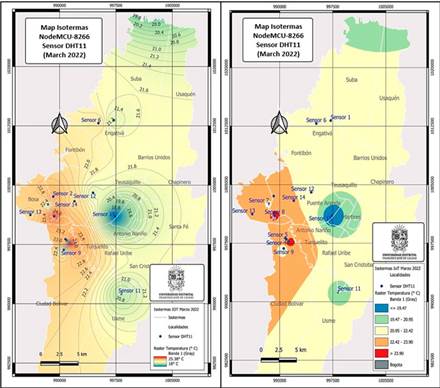 Interpolation is a method through which new points are obtained from a cloud of known points by implementing different mathematical algorithms (e.g., IDW, Kriging, Natural Neighbor, Spline, Spline with barriers, and Topo to raster). The method used in this study corresponds to the inverse distance weighting (IDW) interpolation algorithm. The deterministic model (IDW) uses the effect (weight) generated by the values closest to the unknown point, estimating the unknown values from the distance-weighted interpolation of the known values. This method is based on the existing hypothesis of a spatial correlation, where the value of the variable to be estimated in cartographic terms decreases its effect with increasing distance regarding the known values of the observed variable. In this study, the DHT11 sensors provide temperature (°C) and relative humidity ( %) data, and the spatial location of each sensor is obtained (latitude and longitude). These points are weighted in the interpolation process, in such a way that the weight of observation with respect to their neighbors decreases with the distance from a point in space for which the temperature and relative humidity are unknown.